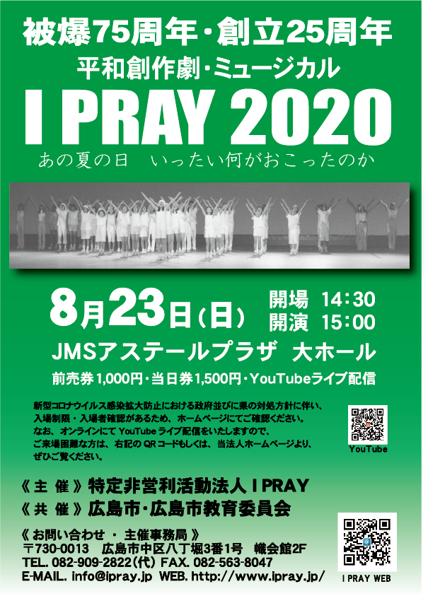 このたびは、こども達の平和創作劇「I PRAY」へのご協力を賜りたくご案内させていただきました。 こども達の平和創作劇「I PRAY」は、1996年に、広島在住のダンス指導家で被爆二世の木原世宥子先生によって結成・活動開始し、それ以降24年間にわたり地道に活動してきました。その間、こども達の劇と歌と踊りを通して多くのみなさんに原爆の悲惨さと平和の大切さ未来への希望を訴え、大きな感動を生んでまいりました。